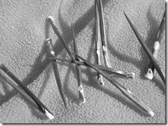 “Did they have sewing needles in the Middle Ages?” Absolutely! The first sewing needles were made from thorns or animal quills. Later needles were made from bone. The oldest known bone needle is estimated to be about 25,000 years old and was found in France. Copper and bronze were used to make needles in ancient Egypt and one dating back to the 3rd Century B.C. was found in Germany. With the advent of the Iron Age, the Romans made needles of iron. All these materials were available to people of Northern Europe in 1226, the date of the Ozark Medieval Fortress. Like today, however, the quality of the tools a person has depends upon how rich he is. In the Middle Ages, the wealthy had metal needles and the peasants had thorn or bone needles. Native Americans used porcupine quills and bone needles. By the time of colonial America, needles were metal and highly valued.